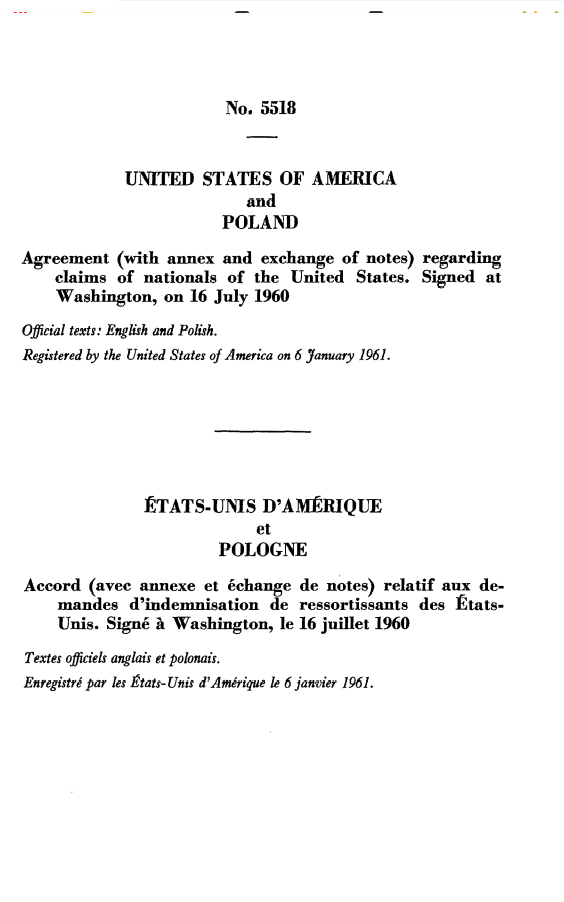 No. 5518. AGREEMENT1 BETWEEN THE GOVERNMENT OF THE UNITED STATES OF AMERICA AND THE GOVERNMENT OF THE POLISH PEOPLE’S REPUBLIC REGARDING CLAIMS OF NATIONALS OF THE UNITED STATES. SIGNED AT WASHINGTON, ON 16 JULY 1960 |