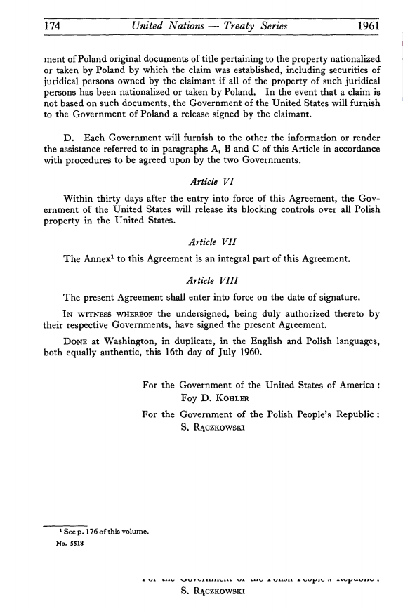 For the Government of the United States of America: Foy D. Kohler For the Government of the Polish People’s Republic: S. RACZKOWSKI |