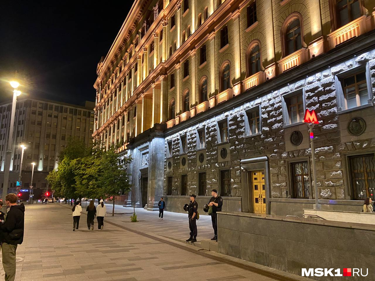 Policjanci w hełmach i z bronią pełnią służbę w pobliżu budynku FSB na Łubiance.