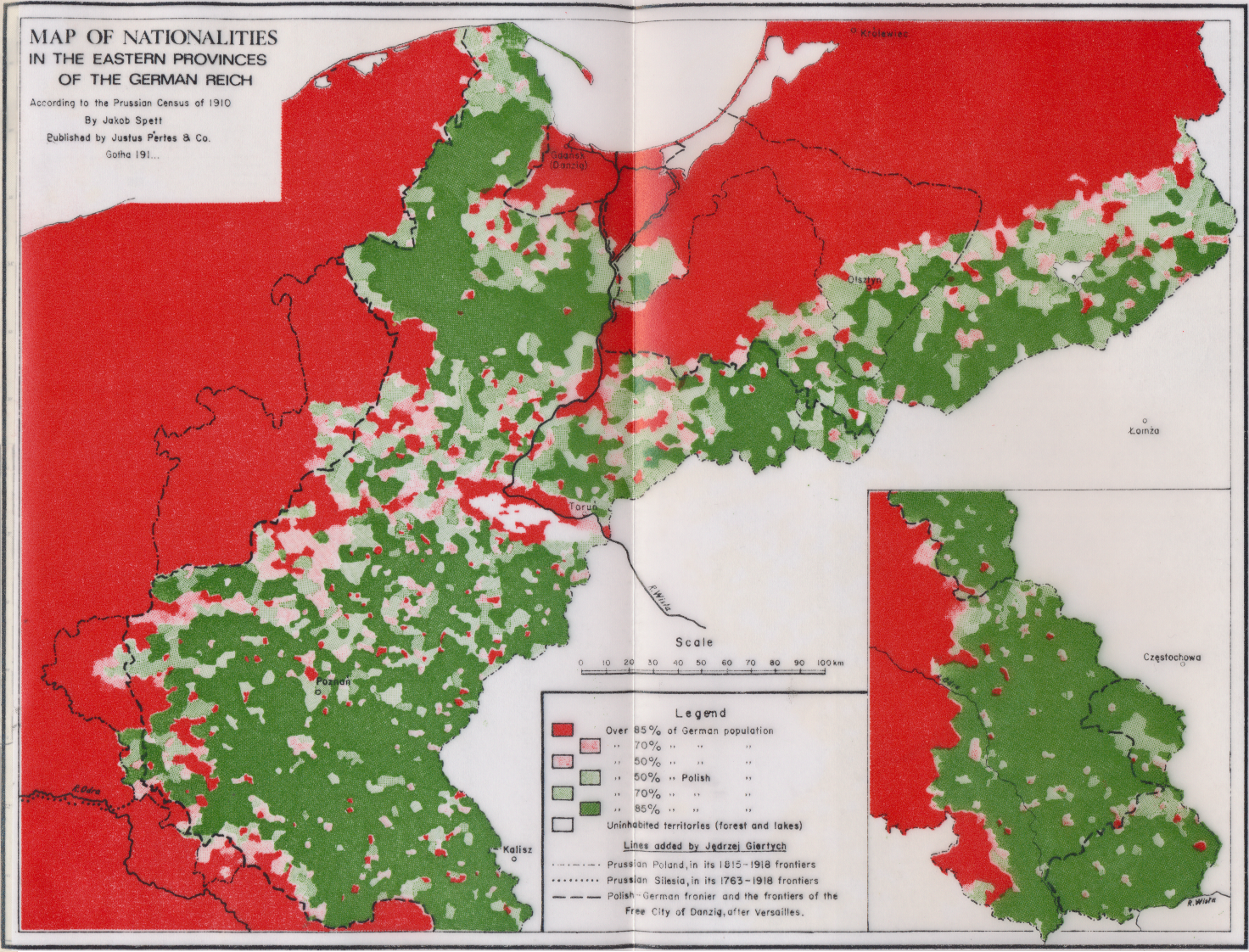 On the reverse—The map by Jakob Spett: “Nationalitatenkarb der ostlichen Provinzen des Deutschen Reiches”, Gotha, Justu PartheSi 1910.