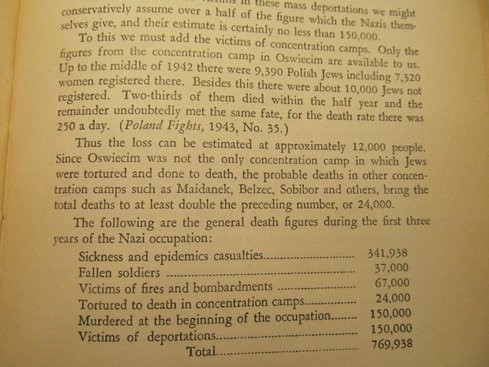 "Tylko liczby z obozu koncentracyjnego w Oświęcimiu są dla nas dostępne. Do połowy 1942 roku było tam 9 390 Polskich Żydów, w tym 7 320 kobiet. Poza tym, było tam około 10 000 Żydów nie zarejestrowanych. Dwie trzecie z tego zmarło w przeciągu pół roku, a pozostałych bez cienia wątpliwości spotkał ten sam los. Śmiertelność tam wynosiła 250 osób dziennie.( Poland fights, 1943, No. 35 ).