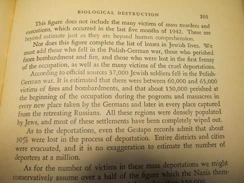 Oto one / tłumaczenie fragmentu "THE BLACK BOOK of POLISH JEWRY" [str.201 ]: Ofiary chorób i epidemii 341 938 / Polegli żołnierze 37 000 / Ofiary pożarów i bombardowań 67 000 / Torturowani na śmierć w obozach koncentracyjnych 24 000 / Wymordowani na początku okupacji 150 000 / Śmiertelne ofiary deportacji 150 000. - RAZEM: 769 938