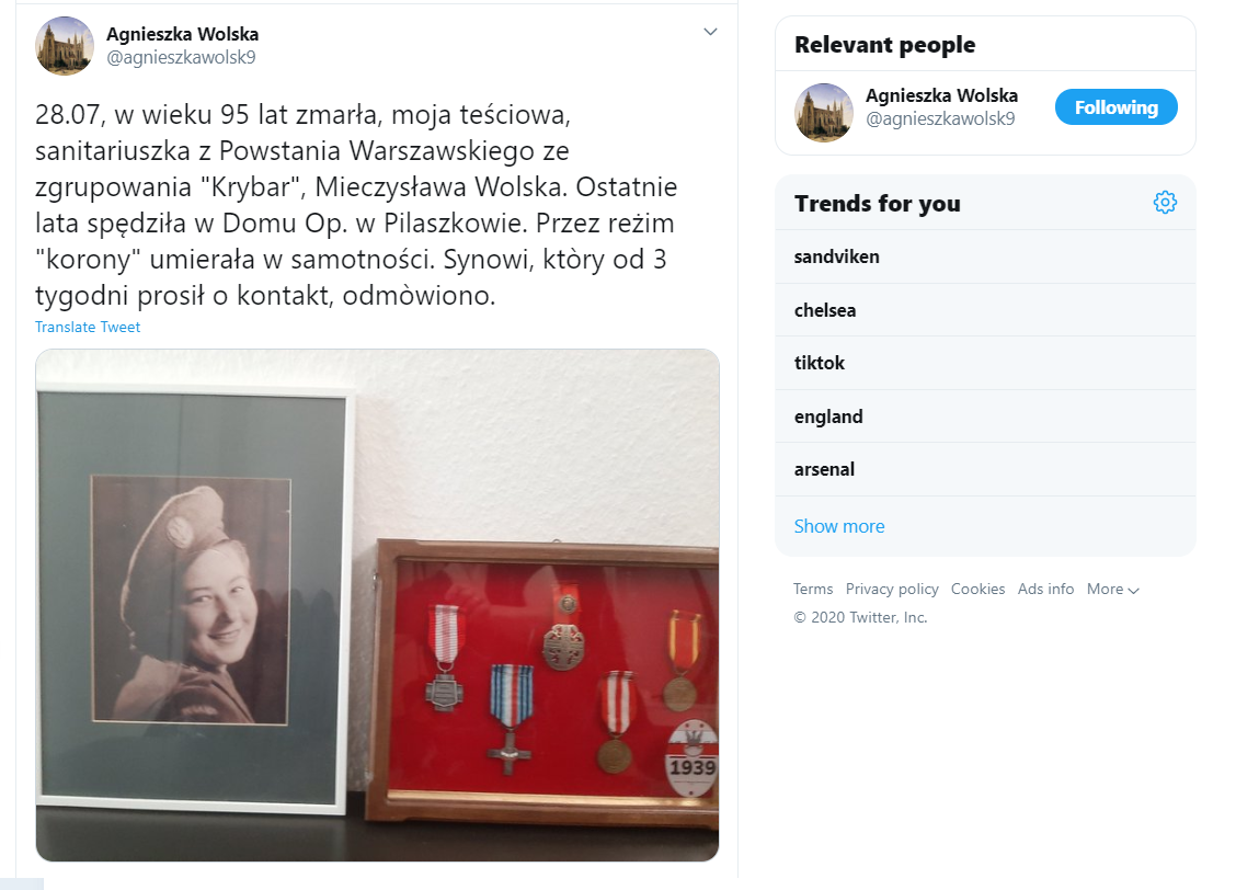 28.07, w wieku 95 lat zmarła, moja teściowa, sanitariuszka z Powstania Warszawskiego ze zgrupowania "Krybar", Mieczysława Wolska. Ostatnie lata spędziła w Domu Op. w Pilaszkowie. Przez reżim "korony" umierała w samotności. Synowi, ktòry od 3 tygodni prosił o kontakt, odmòwiono.