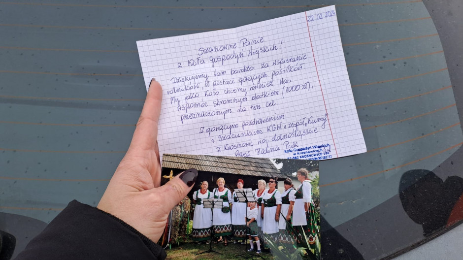 Gesty wsparcia płyną m.in od Kół Gospodyń Wiejskich. Tu KGW z Krosnowic przekazało 1000 złotych na wsparcie finansowania posiłków dla protestujących rolników.