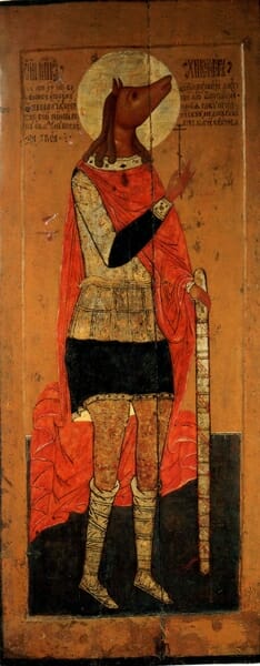The Orthodox icon of St-Christopher presents him as a warrior cynocephalus, a dog-headed man from Lycea. Sometimes he is also of gigantic size as well. According to his tradition, he was a Roman soldier taken from the far end of the world who converted and was martyred by an Emperor.