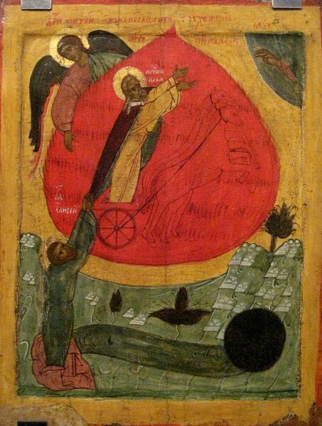 The next examples of water crossing that will bring all of our discussion back on itself are the Jordan crossings of Elijah and Elisha[14]. This happens in the same place as their ancestors, near Jericho, the first city taken by Joshua.  Elijah uses his garment, which was a “hairy garment”[15], a garment of skin, to separate the waters and then leave this world bodily (just as Enoch did before the flood and Moses did before the entry into Canaan), and then Elisha, having received Elijah’s garments with a double portion of his power, used the garments of skin to return to the side of Jericho.  This story is of course symbolically linked to the flood and the Ark, as well as to the crossing of Joshua and Caleb with the Ark of the covenant, and so when we put all of these together we have: giants, garments of skin, arks, dogs, foreigners, and “the savior” who wields all these things in order cross the chaotic waters. What we have before us is an image of baptism, but in a deeper way the image of St-Christopher with Christ on his back crossing the river is also an image of the Church itself.