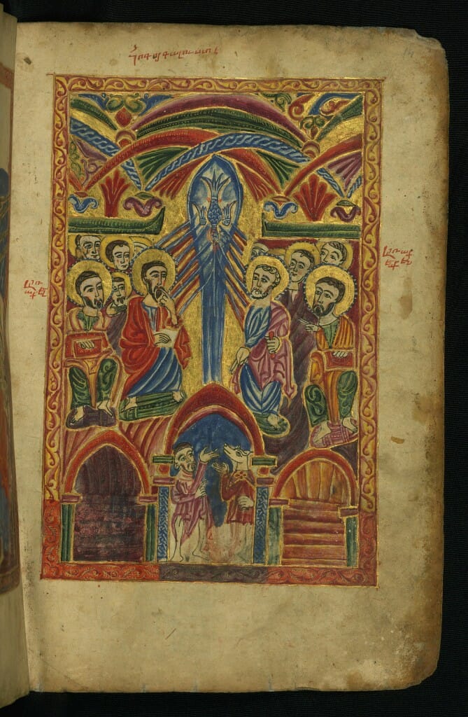 The Dog-headed men are seen as the farthest race present at Pentecost. Because they are the farthest, in some Armenian images they appear in the center of the door or else they appear alone, representing a distilled image of the ultimate foreigner.  There are some other images, for example a well-known image where dog-headed men are represented as the Barbarian enemies who threaten Christ. Sometimes they are seen as one of the races encountered in the mission of the Apostles.