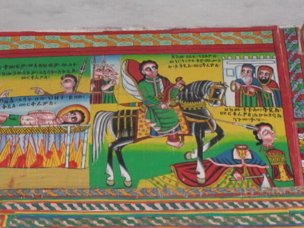 The tradition of St-Mercurios is alive and well in Ethiopia, where I documented these contemporary images of St-Mercurios and his two companions on the outside of a church”