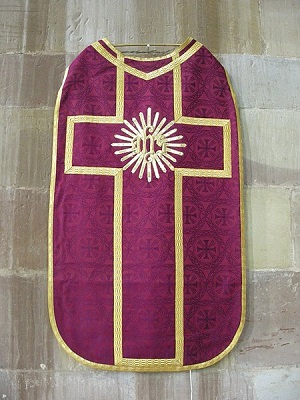 Monogram Imienia Jezus wyhaftowany na adwentowym ornacie.