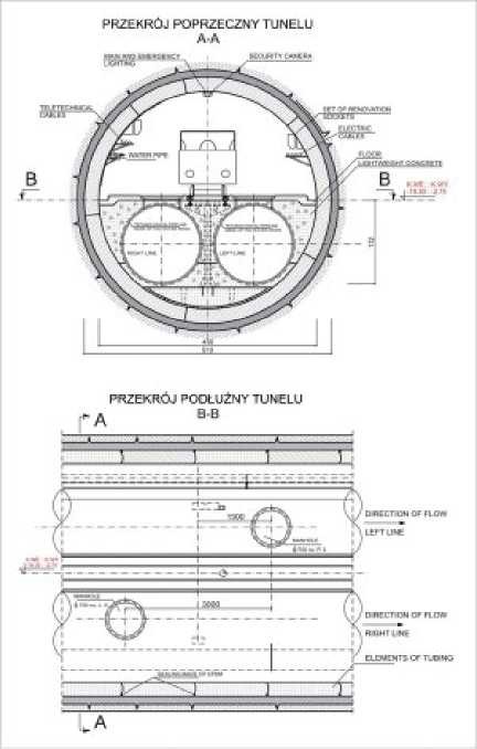 -    dwóch przewodów kanalizacyjnych o średnicy 1600 mm ułożonych we wnętrzu tunelu wieloprzewodowego,