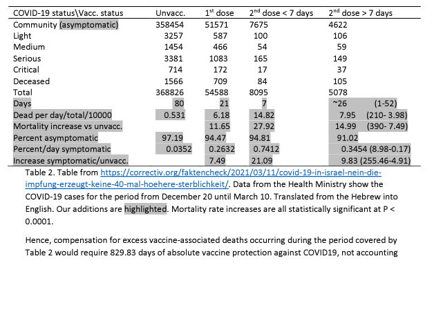 Poniżej przedstawiamy szczegółowo analizę kosztów i korzyści skoncentrowaną na zgonach spowodowanych przez COVID19 związanych ze szczepieniami, ale nie uwzględniających zgonów niezwiązanych z COVID19, związanych ze szczepieniami w dwóch zestawach danych opublikowanych przez Ministerstwo Zdrowia Izraela 11 lutego w Ynet i 11 marca w dniu correctiv.org. Z tych ponownych analiz wynika, że zgony występujące podczas 5-tygodniowego okresu szczepień i pierwszych tygodni po pełnym szczepieniu wymagałyby pełnej ochrony szczepionki przeciwko COVID19 w okresie po szczepieniu wynoszącym około 674,31 dnia (1,85 roku lub 22,2 miesiąca) w przypadku danych Ynet i 829,83 dni. (2,27 roku lub 27,3 miesiąca) na dane z correctiv.org w celu zrekompensowania nadmiernej liczby zgonów z powodu COVID19 występujących w trakcie i tuż po szczepieniu. Zakłada to pełną ochronę szczepionkową, co jest nierealne i nie uwzględnia skutków ubocznych niezwiązanych z COVID19.