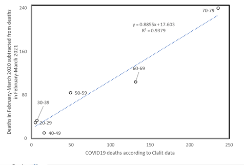 Figure 3. Age-specific excess deaths in February-March 2021 vs 2020 as a function of age-specific COVID19 deaths expected during 2 months according to data from the whole pandemy.