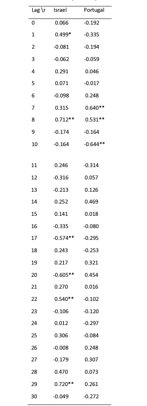 Tabela 4. Współczynnik korelacji Pearsona r między codziennymi nowymi izraelskimi przypadkami COVID (9-21 kwietnia) a dziennymi wzrostami odsetka szczepień w okresie wstecznym 13 kolejnych dni, począwszy od 21 kwietnia (kolumna 2), a dla danych z Portugalii (kwiecień 11-23, kolumna 3). *: P <0,05; **: P <0,05 skorygowany o wielokrotność testu (Benjamini i Hochberg 1995), testy 2-stronne.