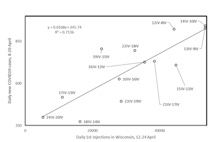 Figure 7. Daily new COVID19 cases (April 12-24) as a function of daily 1st dose vaccinations (April 8-20). For each datapoint, the dates of new case numbers from the y axis, followed by vaccination dates from the x-axis, are indicated.